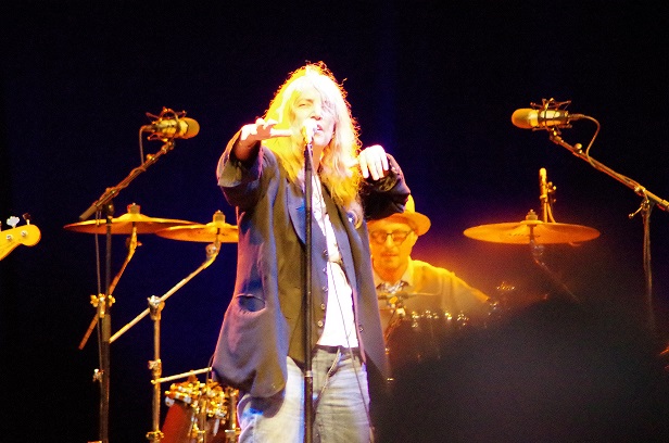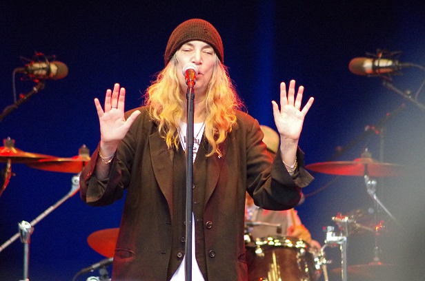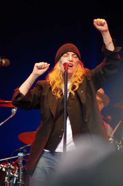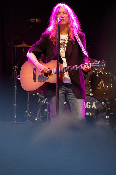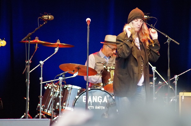 Så efter ett tags väntan och med go reggaemusik i högtalarna så dyker hon upp. Iförd svart mössa och jag var lite ledsen för att det vara fotoförbud men jag tog chansen(likt många andra) ändå och fick några bra bilder. Hon går ut hårt med Dancing Barefoot och man känner nästa tårarna komma för det är så bra och vackert. Hon pratar en hel del om att Jimi Hendrix har spelat på samma scen många år tidigare och kör även en hyllning till honom och en till sin vän Henning Mankell men det är en ganska jobbig sak som i alla fall jag kunde vara utan. Bandet får spela nån funkig låt själva och ibland verkar Patti lite irriterad på något men för det flesta verkar hon väldigt glad när hon spelar. Banga är tung och meditativ och Pissin in the river är ju så bra...